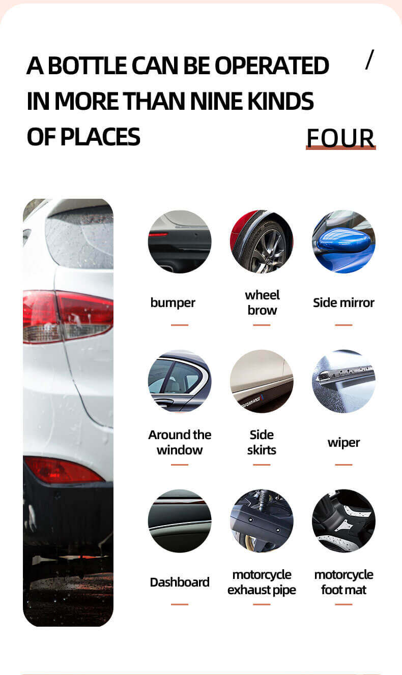 Specially designed for automotive exterior plastics, rubber, and interior plastic and rubber parts engine compartment. Refreshes parts and restores dark colors, preventing UV and protect parts from strong sun and oil damage.