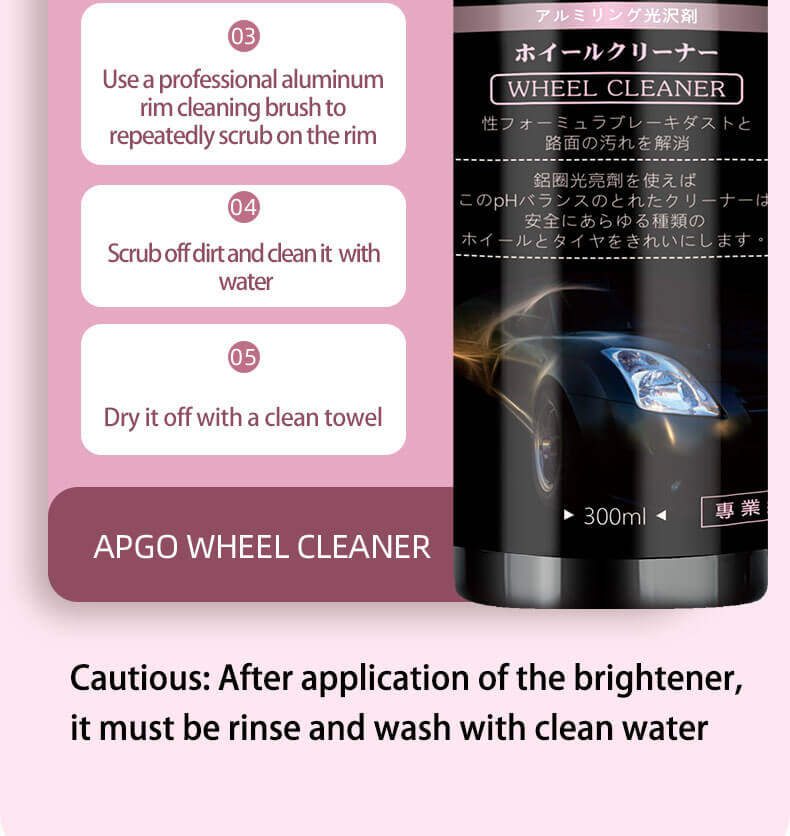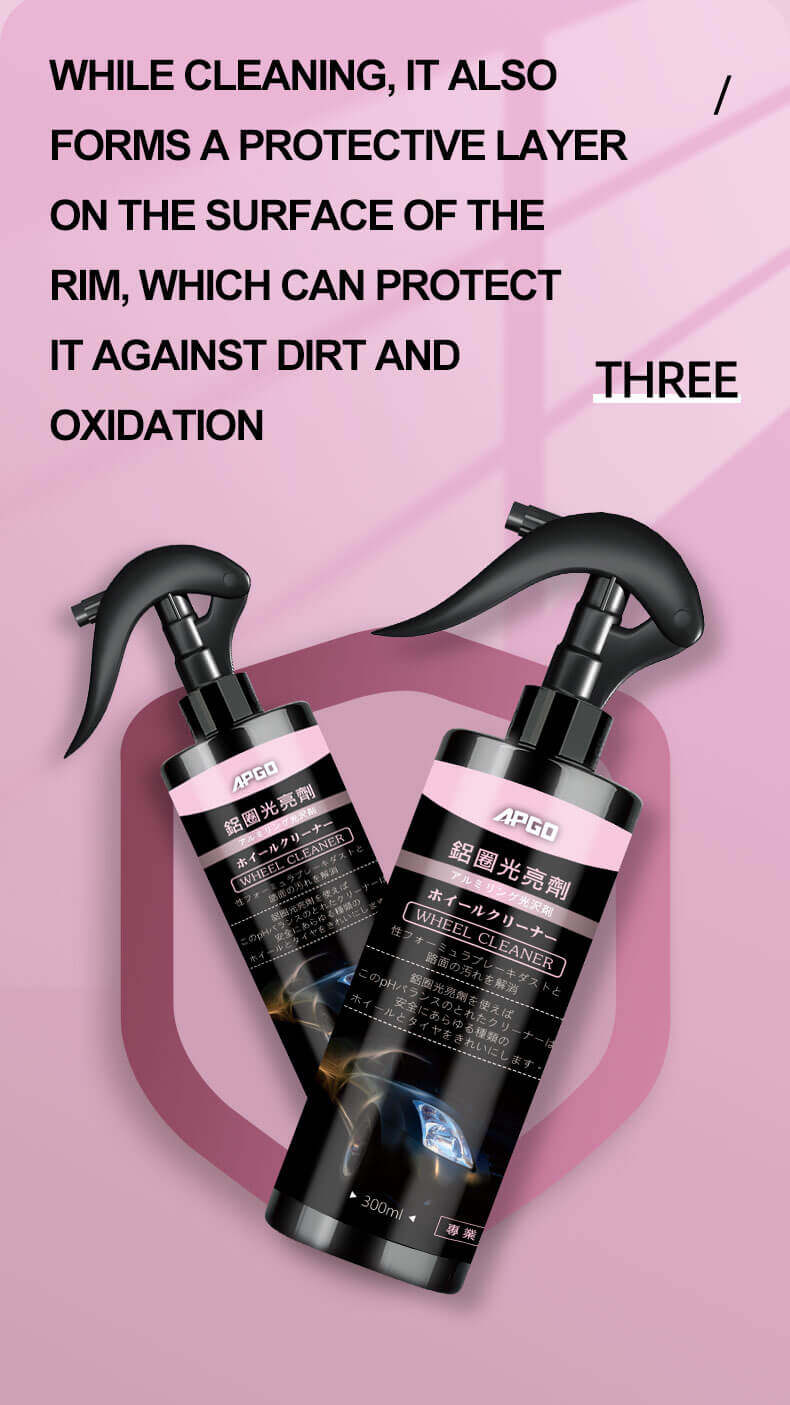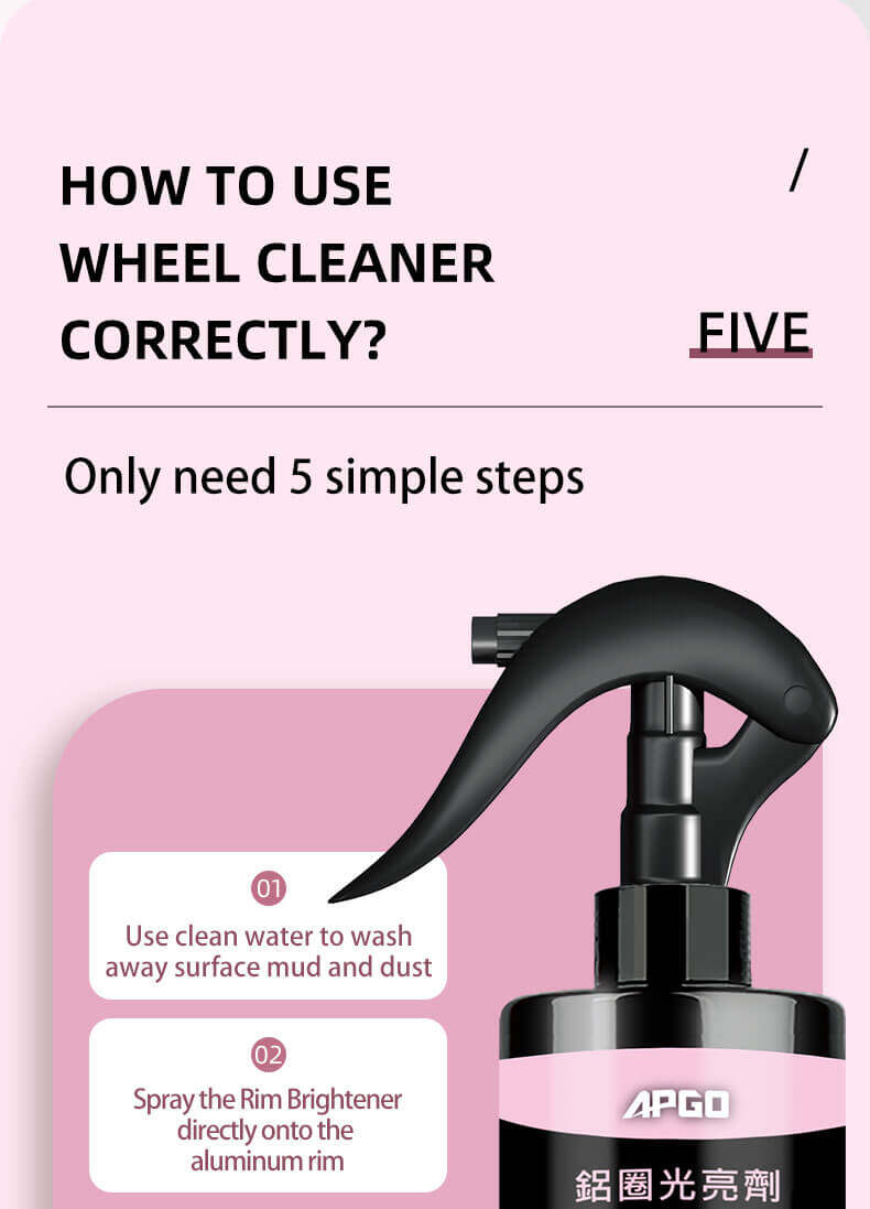 2. Spray on rim surface, let it sit for 1–3 minutes, brush if needed, rinse thoroughly, and wash with shampoo.